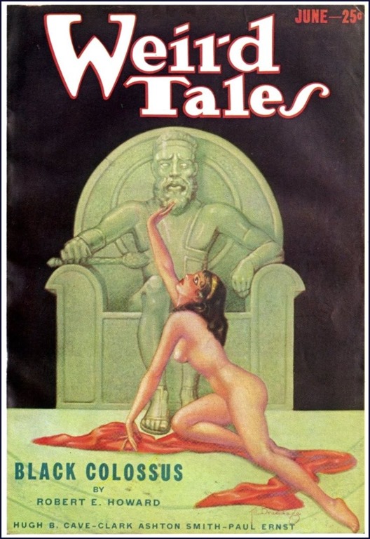 Este cuento gozó del privilegio de recibir la primera de las varias portadas que Weird Tales dedicó al personaje (si en la entrada anterior ya figura alguna, es por tratarse de un relato, La reina de la costa negra, escrito antes pero publicado después). Como esta, todas fueron realizadas por Margaret Brundage, ilustradora especializada (irónicamente) en dibujos que explotaban descaradamente la sexualidad femenina para atraer a compradores masculinos. El uso del pastel otorgaba a sus dibujos una particular textura irreal, almibarando el delicado trazo de los cuerpos y envolviéndolos en un onirismo arrebatador. Por cierto, y como puede comprobarse en esta portada, la artista concentraba sus esfuerzos, con independencia del protagonismo masculino o del tema del relato, en el dibujo de una o varias bellezas semidesnudas (o totalmente desprovistas de ropa), seguramente tras comprobar que en ellos basaba su éxito y, por tanto, los encargos. Así, algunos artistas de la casa acabaron incluyendo en sus cuentos algún episodio que justificase la exhibición de carne femenina. Tal vez el mismo Howard se sintiera inclinado a hacerlo, porque a partir de El coloso negro encadenará un conjunto de historias en los que el cimerio debe proteger a alguna beldad en peligro, que si inicialmente siente rechazo hacia ese gigante cubierto de cicatrices, terminará por caer rendida en sus brazos.