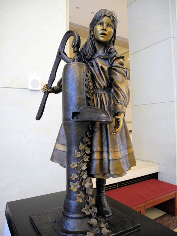 Helen Keller representing State of Alabama by Edward Hlavka 2009 in the US Capitol Vistor CenterHe suspendido durante varias semanas la publicación de artículos debido al largamente esperado viaje que he hecho a Estados Unidos, donde estaba seguro de encontrarme con múltiples referencias visuales, culturales e históricas que conocía de libros y películas. Una de las más emotivas la he hallado en el imponente Capitolio de Washington. En su vasto interior se acumulan las estatuas: cada estado tiene derecho a dos esculturas que representen a personalidades nacidas en él. Pues bien, en el gran vestíbulo central, junto a la escalera de entrada, llama la atención la estatua en bronce (enviada por el estado de Alabama) de una niña que parece refrescarse la mano con el agua de una fuente. Sin embargo, su mera contemplación me produjo un chispazo de emoción: pues se trata de la representación de Helen Keller, la joven ciega, sorda y muda que gracias a los abnegados esfuerzos de su maestra, Anne Sullivan, consiguió abrirse a la comunicación (y por tanto al mundo que le vedaba su carencia de sentidos «normales») al descubrirle esta la relación entre las palabras y las cosas, entre el significante y el significado. Es una historia sobradamente conocida gracias a la película El milagro de Ana Sullivan, y la escultura muestra el momento culminante de la historia en que la niña descubre su primera palabra. Desde que asistí a él por primera vez —y no a través de la película, sino de un irrepetible Estudio 1 de TVE, con Tina Sáinz encarnando a la maestra—, no ha dejado de emocionarme, y a ratos quiero creer (tal vez sí sea un mitómano, después de todo) que en buena medida me inspiró mi propio camino como enseñante.