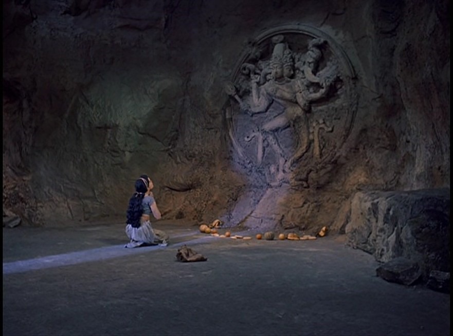 En otro momento, en plena persecución de los hombres de Chandra, los dos amantes se esconden en una cueva donde hay una imagen de Shiva a la que ella le pide protección. En el acto, una araña teje una enorme tela en la angosta entrada de la cavidad, que engaña a los perseguidores, pues les hace creer que no han podido pasar por ahí. Berger recibe con escepticismo las palabras de Seetha cuando ésta le impide comerse uno de los frutos que ha ofrendado a la diosa; sin embargo, al quedarse solo mientras ella sale a por agua, nada más tocar una naranja, escucha los gritos de su amada, sorprendida por sus perseguidores. ¿Fatalidad, inevitabilidad o sencillamente furor de la diosa por el sacrilegio de arrebatarle la ofrenda?