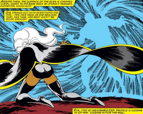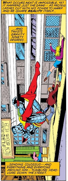 Acción y reflexión se funden de modo espléndido. Claremont aprovecha cualquier resquicio para enriquecer la narración con el desarrollo psicológico de los personajes, sobre todo mediante el énfasis discursivo de diálogos y pensamientos. En particular, es memorable la demostración de liderazgo que realiza Cíclope en la pausa que efectúan los Hombres-X antes del enfrentamiento final en Edimburgo, al comprobar la maltrecha moral a que han quedado reducidos tras su primera pelea contra Proteo, provocando su rabia contra él mismo a modo de catarsis (sobre todo de Lobezno: una buena idea puesto que este siempre había cuestionado la jefatura de Summers). En cuanto a Byrne, en estos números termina por demostrar su capacidad para dibujar cualquier cosa. El poder de Proteo para alterar la realidad, es evidente, suponía toda una golosina en manos de un dibujante como él, y aquí brindó varios de los grandes momentos de la serie: buen ejemplo es esa viñeta en que el villano gira la gravedad 90 grados y Coloso cae horizontalmente hacia abajo (la viñeta, claro, es vertical, pero la gracia nace de la torsión entre los dos ejes).