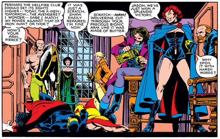 Por supuesto, la Patrulla-X está siendo víctima de un complot, minuciosamente preparado por el «círculo interno» de una antigua y venerable institución neoyorquina llamada el Club Fuego Infernal (inspirado en una célebre sociedad londinense del siglo XVIII cuya leyenda negra está asociada al satanismo y la perversión sexual), cuyos integrantes, asimismo mutantes, aspiran al poder por el poder. El plan se basa en el control que uno de ellos, el tal Wyngarde, está efectuando de Jean Grey, infiltrándose en sus pensamientos para hacerle creer que es la Reina Negra del club, bajo la ilusión dieciochesca. En realidad, Wyngarde es un viejo enemigo de la Patrulla-X (y de muy poca monta), Mente Maestra, mago de las ilusiones —es genial cómo Byrne nos alerta a los lectores mucho antes de que lo sepamos: la sombra que proyecta Wyngarde no es la del hombre joven y vigoroso que parece, sino de un tipo mucho menos elegante y de mayor edad—, el cual, gracias a las habilidades telepáticas de otra integrante del club, la Reina Blanca, está proyectando en la mente de Jean esas falsas vivencias con objeto de dominar su personalidad.