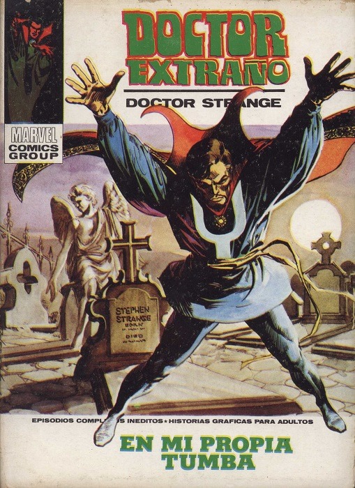 Doctor Extraño, por Lopez EspiLos amantes de ese volumen 1 (cuyos ejemplares hoy se cotizan alto en el mercado del tebeo de segunda mano) señalan que la presentación era muy atractiva. En primer lugar, las portadas poseían la textura de una ilustración pictórica, buscando un efecto de volumen que no existía en las originales, y de enorme calidad, no en vano las realizaron dos profesionales muy relevantes. El primero fue Enrich, si bien a los pocos meses abandonó la casa para consagrarse a proyectos para editoriales extranjeras que le otorgarían un notable prestigio allende nuestras fronteras. Su sustituto, el gran Rafael López Espí, asumiría, hasta el final de Vértice, el monopolio de este trabajo. Su trabajo pasaría por etapas muy divergentes, pero en sus mejores momentos, correspondientes casi por completo a este volumen 1, ofreció una calidad extraordinaria, en especial los trabajos que realizó en torno a 1973, que son los más recordados, cuando el artista decide prescindir de la copia o la reelaboración. El esquema compositivo al que pertenecen sus mejores trabajos consistió en combinar a una figura en primer plano con un fondo de color más tenue, creando un sugestivo efecto de asociación entre uno y otro. Aprovecho para indicar que la mayor parte de las ilustraciones de este artículo están extraídas de esa etapa (un desglose de todas las colecciones de Vértice, con sus datos básicos y portadas, puede encontrarse en esta imprescindible página: www.universomarvel.com).