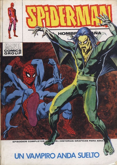 Así, por ejemplo, mi lectura marvelita comenzó leyendo dos tebeos de Spiderman, los números 22 (El artero Lagarto) y 24 (Las alas del Buitre), a los que unas semanas después añadí un tercero, el 48 (Un vampiro anda suelto). Los dos primeros se caracterizaban por su dibujo agradable, pródigo en rostros bellos (sobre todo de las chicas) y narraban dos historias que permitían familiarizarse con rapidez con el entorno habitual de ese joven estudiante universitario, Peter Parker, cuya personalidad secreta se entromete continuamente con la privada, combatiendo en este caso a dos de sus villanos clásicos. En cambio, el 48 contaba una historia increíblemente siniestra, en la que a Spiderman le han salido cuatro brazos extra, convirtiéndolo en una verdadera araña humana, mientras persigue a un vampiro de rostro horripilante. Un planteamiento más propio del terror, a lo que contribuía un dibujo notoriamente distinto al anterior, más áspero, mucho menos «bonito» (por ejemplo, la chica que le gustaba a Peter, Gwen Stacy, aparecía fugazmente —¡y ya era su novia!—, ahora aparecía mucho menos guapa).