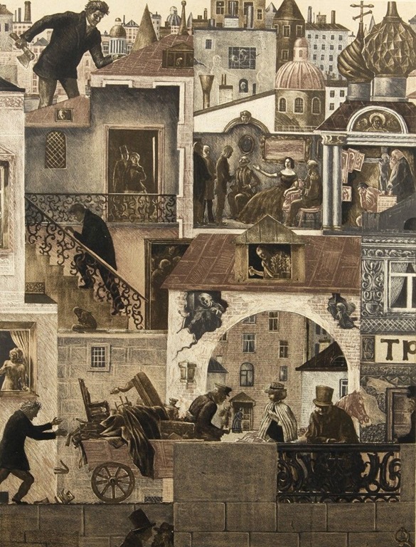Ilustracion para Crimen y castigo, por viktor VilnerLos personajes memorables abundan en este relato, pero voy a destacar, en especial, a dos. El primero es el más ligado a la ortodoxia de la novela policiaca, pues no es sino Porfiri Petrovich, el juez de instrucción que no tarda en comprender que Raskólnikov debe ser el autor del crimen y que, como clásico personaje del género (uno piensa en el futuro teniente Colombo), juega al gato y al ratón con este, sin perder nunca de vista que, en efecto, no se encuentra ante un mero asesino y, por ello, se guarda siempre la carta de convencerlo de que no hay más posibilidad (fuera del suicidio, que no desea) que entregarse, tanto más cuanto que no tarda en aparecer un infeliz sugestionado con el concepto de culpa que se acusa de la muerte. El segundo es Svidrigailov, el hacendado rural que ha acosado a Dunia, la hermana del protagonista, en la ciudad de provincias natal de este, y que la sigue a San Petersburgo (es uno de los varios subargumentos de la novela, y uno de lo más atractivos), colándose en la vida de Raskólnikov hasta el punto de escuchar la autoconfesión de este a Sonia, la hija de Marmeládov, el ángel bueno de la novela. En su persona, Dostoyevski creó uno de esos seres, tan profusos en su obra, malsanamente construidos a base de luces y sombras, objetivamente malvado (pero no tanto por vileza como por desprecio del buen orden) pero capaz de actos extrañamente generosos, acechado por las sombras de su pasado (¡que incluyen el abuso de una niña que acabó suicidándose!) y cuya salida de escena es literalmente inolvidable.