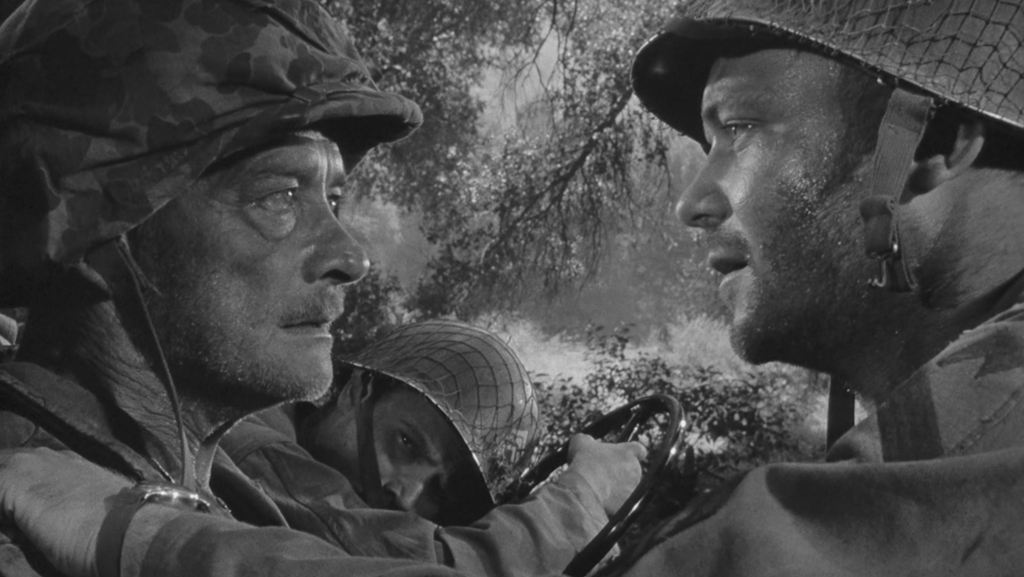 Men in War efectúa una de las más ceñudas miradas que jamás se han vertido sobre el hecho bélico. Los soldados que aparecen en su decurso son meras sombras que transitan por un paisaje seco, implacablemente iluminado por el sol (no hay mejor manera de desnudar el horror que hacerlo bien visible), mientras son eliminados por otras sombras, caminando hacia delante por pura inercia, aceptando correr riesgos suicidas sencillamente porque no están preparados para pensar o decidir por su cuenta: porque lo peor de las guerras es creer en su inevitabilidad y aceptar convertirse en uno de sus engranajes. Por supuesto, ni Mann ni sus guionistas pretenden convertir a esos diecinueve hombres en seres abyectos, en meras máquinas de matar —aunque uno de ellos, precisamente el sargento Montana/Aldo Ray, responde a esta descripción y, lógicamente, será uno de los que sobrevivan—, sino en seres humanos con sus anhelos y miedos, con sus debilidades y fortalezas. Unos no pueden evitar dejarse llevar por el miedo (el soldado, encarnado por Nehemiah Persoff, que sale huyendo al descubrir que están en un campo de minas y vuela por los aires), otros han erosionado tanto su resistencia que se dejan dominar por la sensación de la enfermedad, más mental que física (el joven soldado asumido por Vic Morrow), otros encuentran la muerte cuando, en un breve momento de temeridad, se sientan a un lado en el camino, hartos de tanto horror, para adornar el casco con unas flores o desentumecerse los pies (el sargento negro al que da vida James Edwards).