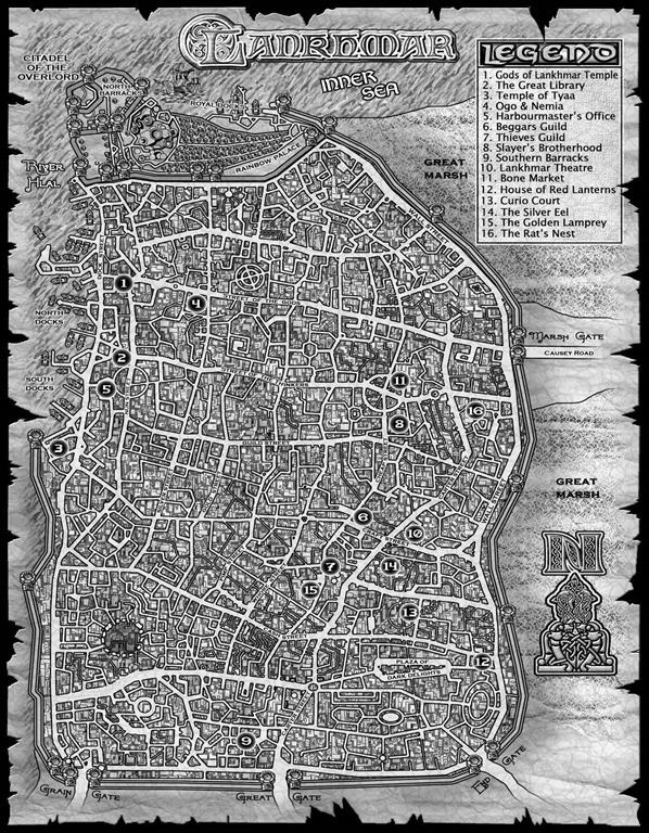 Su centro de acción es la principal ciudad de ese mundo, llamada Lankhmar, fabuloso enclave de calles laberínticas, al borde del mar (lo que permite numerosos episodios marinos), donde conviven aristócratas y pordioseros, religiones de toda laya, hechiceros de una y otra categoría, y donde constituyen una fuerza rectora poderosos gremios como el de los Ladrones (con el que los dos protagonistas, inveterados amigos de lo ajeno, siempre mantienen complicadas relaciones). Leiber supo asumir la herencia de Robert E. Howard (pues su urbe bien podía haber pertenecido a la Edad Hyboria) y convirtió Lankhmar en uno de los más fascinantes escenarios de toda la literatura fantástica, de tal modo que casi todos los relatos que en ella transcurren son memorables. Con justicia, suele destacarse el titulado Aciago día en Lankhmar (publicado en 1970, año en que arrasó en los principales premios de la fantasía), que narra, además, el primer encuentro entre los dos amigos, precisamente enfrentados al Gremio de los Ladrones, en cuyo cubil penetran para ajustar cuentas con el hechicero que ha acabado con sus dos amantes.