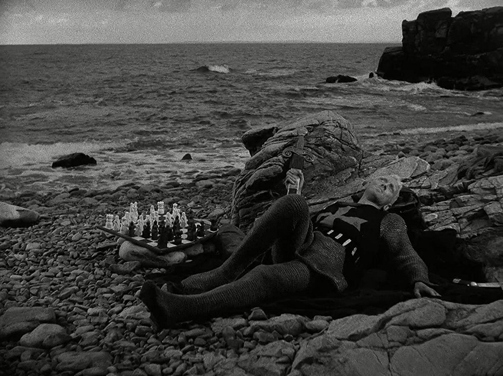 ¿Quién puede olvidar el inicio de El séptimo sello, posiblemente uno de los más sugestivos de la historia del cine? En una playa rocosa, cuyo lecho está poblado de aguzados guijarros, el caballero y su escudero descansan unas horas de su camino (pero el lugar es tan inhóspito que sirve de perfecto símbolo de lo que será su devenir a lo largo del film: la imposibilidad de encontrar un refugio, un consuelo, un santuario). El escudero duerme a pierna suelta; el caballero, inquieto, no lo consigue, y despliega ante sí el tablero de ajedrez para entretener su insomnio. De pronto, sin que se haya podido ver cómo ha llegado, aparece una figura vestida de riguroso negro, con el rostro enmarcado por la siniestra indumentaria. Se trata de la Muerte, que viene a por el caballero Antonius, al que le dice que lleva ya tiempo marchando a su lado. Y el caballero asiente, pero se resiste a rendirse sin más (tiene todavía muchas preguntas que deben ser respondidas), por lo que la reta a una partida de ajedrez.