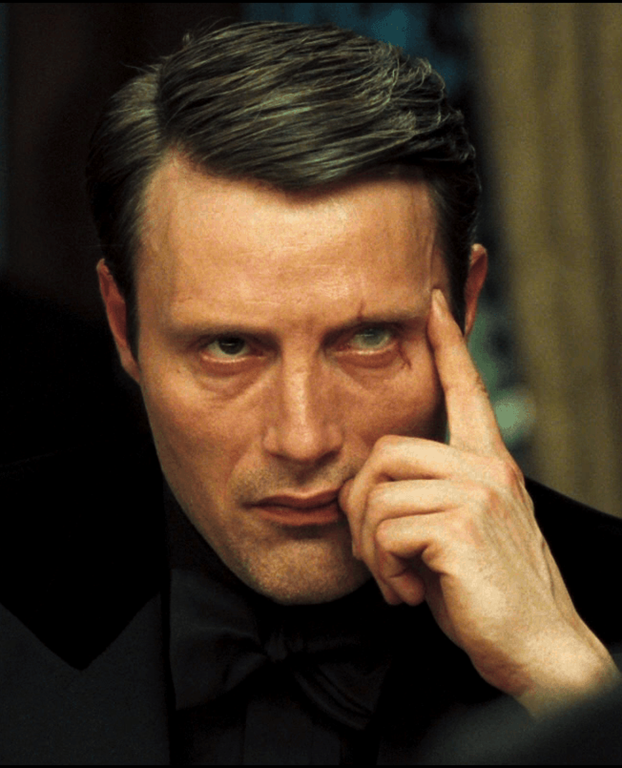 Mads Mikkelsen es Le ChiffreEl villano del film, extraído de la novela, es un banquero especializado en la financiación del terrorismo internacional. Se llama Le Chiffre y es un malo típico de la saga, comenzando por el detalle pintoresco de rigor (inventado por los guionistas): además de ser asmático y usar continuamente un inhalador, tiene una cicatriz en el ojo, del cual gotean de cuando en cuando lágrimas de sangre. Lo encarna el danés Mads Mikkelsen, un intérprete caracterizado por una expresión de hieratismo que a mí siempre me ha parecido que solo esconde el vacío. Eso sí, protagoniza una de las escenas más fuertes del universo bondiano, y que simboliza bien el incremento de la crudeza con Daniel Craig. Es el momento en que Le Chiffre, para conseguir de Bond una contraseña bancaria, lo tortura del modo más salvaje que un hombre puede imaginar: desnudo, sentado en una silla con el fondo arrancado, para mejor golpearle los genitales con una soga que termina en un nudo que duele con solo mirarlo. En su momento, se dijo que el villano lo que hacía era amenazar la esencia central de Bond, su masculinidad. Y yo añado (supongo que alguien más lo habrá hecho) que también simboliza la desaparición del celo sexual del personaje: Daniel Craig se enamorará, sí, pero no se apareará sin más. El sexo deja de ser un mero disfrute: ¿la maduración de Bond?