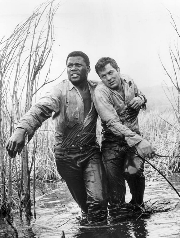 Poitier y Curtis, en FugitivosEl salto, que incluyó su primera nominación al Oscar al mejor actor, lo dio con Fugitivos (1958). Hoy olvidada, esta película obtuvo un rotundo éxito en su día, sobre todo crítico. Su director, Stanley Kramer, que antes había destacado como productor en el mismo sentido, era uno de los cineastas más notorios del Hollywood liberal, como revela una filmografía siempre comprometida, aunque por desgracia pocas veces consistente (diez años después volvería a llamar al actor para la famosa Adivina quién viene esta noche), sobre todo porque sus tramas siempre se desarrollaban del modo más previsible. Al menos, Kramer solía tener el buen sentido de incrustar sus premisas ideológicas dentro de una cobertura genérica que proporcionara un mínimo marco de interés. En este caso, la trama versa sobre la desesperada fuga de dos convictos, y la caza policial que se organiza tras ellos. La particularidad es que los dos fugitivos, obligados a unir esfuerzos porque están encadenados, son un blanco y un negro. El blanco, por fortuna, no se dibuja como un emblema del racismo (sabiendo que esos dos tipos que inicialmente no se llevan nada bien acabarán respetándose e incluso esbozando algo parecido a la amistad, hubiera sido forzar demasiado las tintas, y más teniendo en cuenta el escaso talento del cineasta), sino como un sujeto agrio sin más, que si de entrada mira con hosquedad el color de piel de su compañero es porque su mente más bien primitiva es lo que está acostumbrado a considerar. En cuanto al personaje de Poitier, como era de esperar es dibujado de entrada como alguien más simpático, pero lamentablemente, a medida que avanza la historia, de él acabaremos sabiendo mucho menos que de su compañero, que es sobre quien se realiza un retrato psicológico más detallado: la estrella del film, después de todo, era el actor blanco, Tony Curtis.