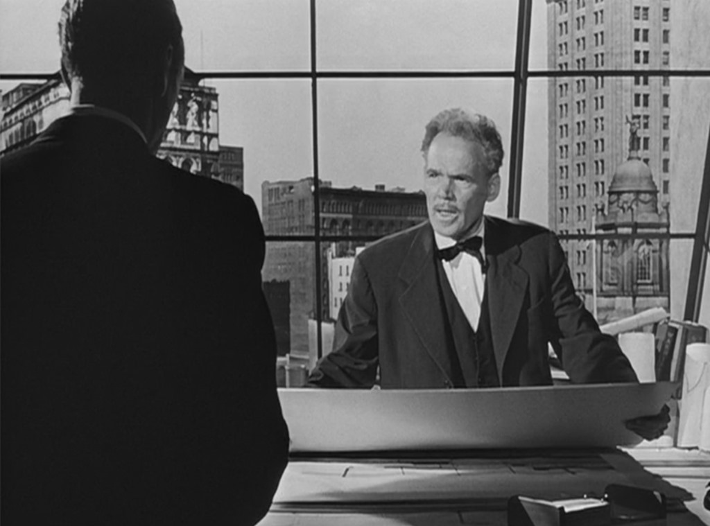 El mejor ejemplo es su inicio, para mí, y aquí sí que no quiero refugiarme en ningún relativismo, el mejor inicio de toda la historia del cine. Se trata de la presentación de su personaje protagonista, consistente en tres planos que repiten la misma composición, con aquel de espaldas y en penumbra, en el espacio más cercano al espectador (el propósito de identificación entre uno y otro es evidente), sin que veamos su rostro y sin que hable o se mueva puesto que quien lo hace es su interlocutor. Tres planos. En el primero, el hombre de espaldas está siendo expulsado de su facultad: el decano le reprocha su carencia de respeto por los clásicos, su petulante búsqueda de vanguardismo, y dictamina que nunca será arquitecto. En el segundo, su compañero de facultad (Peter Keating, quien luego, a lo largo de la película, será la personificación del arquitecto mediocre y servil, el doble negativo del protagonista) le reprocha, suavemente, casi temiendo despertar su ira, la ausencia de cualquier sentido del compromiso en su carácter. En el tercero, un viejo arquitecto, Henry Cameron (al que en la previa escena, Keating ha puesto de ejemplo ante su amigo como un hombre acabado precisamente por su rechazo de todo compromiso artístico), a la vista de los planos y dibujos que le ha presentado para pedirle trabajo, le recrimina acerbamente su petulancia por querer ser un mártir por ser fiel a sus principios, que es lo que, le dice, sucederá inexorablemente si, como él, no cede ante los demás. Al final de su discurso, Cameron suaviza el tono y le indica que empieza a trabajar con él desde el día siguiente. Entonces le pregunta su nombre, y es cuando el plano cambia al hombre que ya está en la puerta del despacho y, mostrando su alargada figura (enfatizando esa orgullosa individualidad que será su sello), el protagonista da su nombre: Howard Roark.