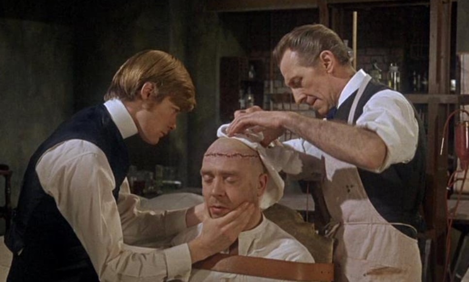 En esta película se encuentra mi interpretación favorita de Peter Cushing en el personaje. Es increíble asistir al modo en que maneja como quiere a aquellos a quienes considera sus inferiores: a los compañeros de pensión que se han permitido comentar con desagrado las actividades que hicieron famoso a Frankenstein («No sabía que ustedes eran doctores», es el inicio del parlamento mediante el que los fulmina) y a esa pareja de enamorados cuyo intenso sufrimiento no conseguirá inspirar la solidaridad del espectador. Rubios y blandos, de aspecto anodinamente angelical, no podrán escapar a su propia mediocridad y no solo no opondrán obstáculo alguno a la humillante degradación a que los somete Frankenstein sino que también se dejarán arrastrar al asesinato: es para admirar el destello triunfal en los ojos de Cushing al comprobar cómo el joven médico apuñala al vigilante nocturno que lo ha sorprendido robando material médico.