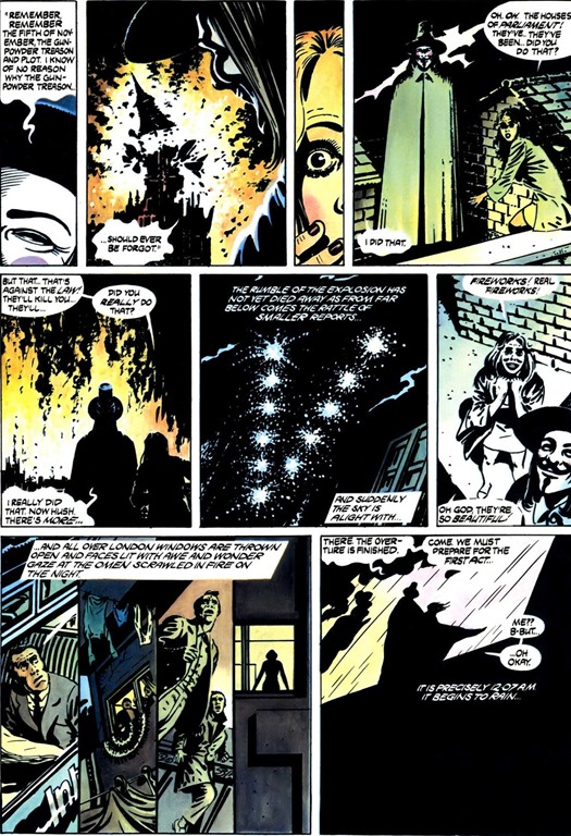 Posiblemente, ni Alan Moore tenía completamente clara la base metafísica y dramática de esa revolución que estalla en las últimas páginas de la historia. La excesiva ambición, en todos los órdenes, acaba provocando una inconveniente dispersión de ideas, que arrastra a los personajes, sobre todo a V y a Finch. La deriva final de este último (que acude a los fantasmales vestigios del campo de concentración donde nació su oponente para vivir allí una experiencia con drogas que, supuestamente, lo iluminará y conducirá hasta él) resulta más bien arbitraria, pero a la vez muy sugestiva en cuanto que Moore abandona al personaje por un muy personal sendero de abstracción, que es el lugar natural para alguien en el fondo tan poco ligado a la realidad que lo circunda. Eso sí, se tiene la fastidiosa sensación de que su función principal es la de permitir la muerte (el sacrificio) de V y poco más.