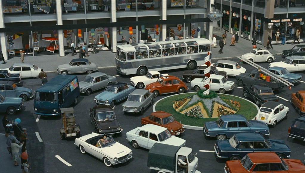 Playtime concluye mediante una declaración visual de intenciones que no puede ser más divertida e ingeniosa: los vehículos, entre los cuales está el autobús donde se van las turistas (una de ellas, recuérdese, ha sido el objeto del fallido love affair de Hulot), atrapados en un gigantesco embotellamiento, giran y giran en una rotonda como si compusieran un gigantesco tiovivo.