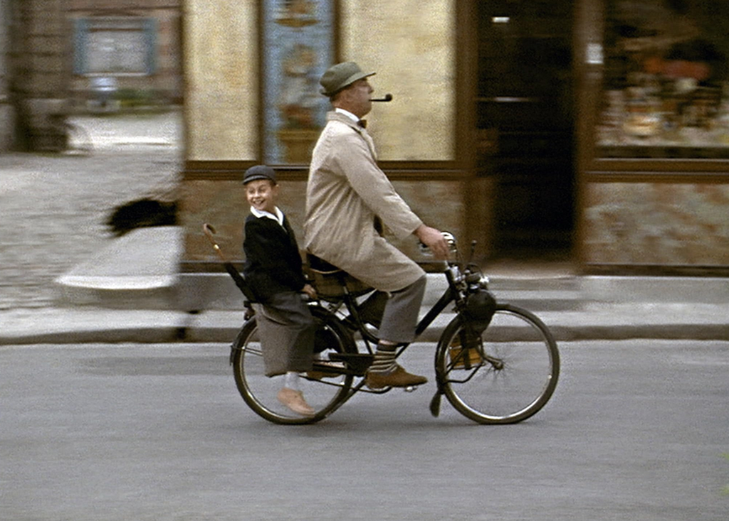 En Mi tío, Tati se permite una malicia: su vecinita de abajo parece platónicamente enamorada de él, pero su condición de niña hace que ni se plantee una posibilidad de romance; ahora bien, cuando Hulot se marcha de la ciudad en el final de la película, de pronto ella aparece vestida y maquillada como una adulta… En todo caso, en el film lo que tiene Hulot es una familia: una hermana y un cuñado que forman un matrimonio que parece surgido de un tebeo de la editorial Bruguera de los años cincuenta por ser epítome de todas las convenciones pequeño-burguesas, comenzando por el afán de ostentación. Ella parece estimarlo, pero como a una mascota; él lo considera un estorbo, sobre todo porque parece atraer demasiado el cariño de su hijo (el sobrino que justifica el título del film) y además lo tiene por un inútil cuya continua aparición por casa les arrebata ese tono que pretenden darse. Dejo para el comentario de Tráfico la última variación propuesta por el cine sobre los sentimientos y las afinidades en el ciclo Hulot.