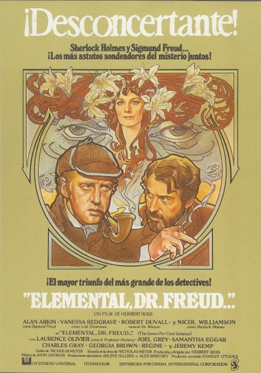Si el film de Wilder aborda la relación, inexplorada en el Canon, de Holmes con el amor, pocos años después otra película se propuso desvelar las claves psicoanalíticas del personaje (y mejor no preguntarse si era necesario: de haber salido un buen film, la cuestión sería irrelevante). Se trata de Elemental, doctor Freud (1977), película dirigida por Herbert Ross a partir de una novela del propio guionista, Nicholas Meyer (luego, a su vez, director de cine), cuyo título original, eso sí, no es tan ingenioso como el español: La solución al siete por ciento, ya sabemos a qué se refiere.