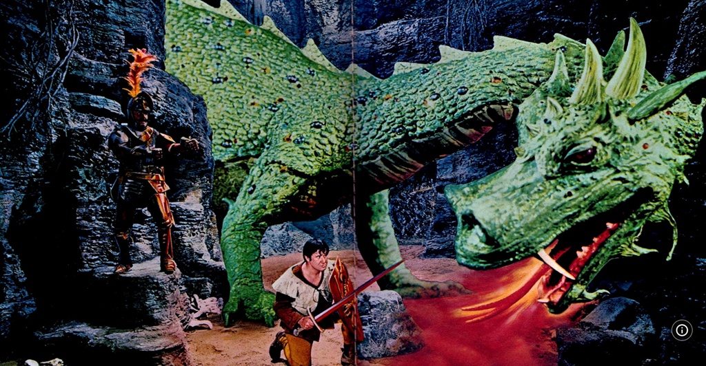 Los responsables de la Metro Goldwyn Mayer, el estudio que siempre se consideró el más importante de Hollywood, decidieron dar el paso adelante y producir, el mismo año de 1962, dos películas de ficción, la que nos ocupa y la mucho más célebre La conquista del Oeste. Pese al éxito obtenido, sobre todo por la segunda, el enorme coste de los rodajes y la necesidad de salas especiales acabaron descartando nuevos proyectos. El western, único caso que conozco, sería repuesto después en pantalla normal y comercializado en formato doméstico y en televisiones, siempre con el inconveniente de que la unión entre las tres partes de la imagen era demasiado evidente (en los tiempos del video, además, para ajustarse al canónico 4:3 de los televisores de otrora —¿hemos olvidado ya que una vez justificaron su apodo de «pequeña pantalla»?—, las ediciones mutilaban la anchura original). En el caso de El maravilloso mundo de los hermanos Grimm, sin embargo, he podido acceder a una versión restaurada que disimula mejor esas líneas, si bien presenta otro inconveniente, derivado del paso de una imagen curva a otra plana: las líneas rectas (por ejemplo, las calles o las fachadas de casas) se alabean de modo evidente.