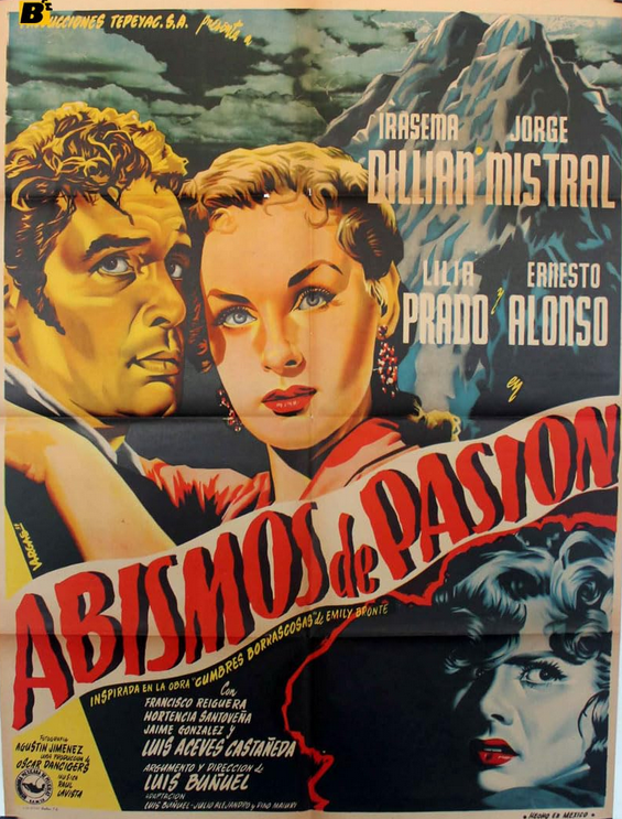 Entre ambas películas Buñuel rodó otra —de hecho, en ese lustro inicial de los cincuenta realizó hasta once films, sin contar Robinson Crusoe (1952), producida por Hollywood— que no solo me parece estupenda sino además una de las mejores adaptaciones literarias jamás efectuadas. Se trata de Abismos de pasión (1953), folletinesco título que encubre nada menos que una versión de Cumbres Borrascosas, la genial novela de Emily Brontë. De hecho, aunque seguramente el rebautizo se deba a esa desmedida inclinación del cine charro por lo melodramático, me gusta pensar que también es una manera de avisar de que no estamos ante una adaptación mimética más sino ante una propuesta personalísima. Buñuel y Julio Alejandro tienen la audacia de prescindir del habitual arranque de la historia que narra la infancia de quienes serán luego los amantes malditos, para comenzar in medias res, es decir, justo en el momento en que el Heathcliff de esta historia, ahora llamado Alejandro, regresa a su antiguo hogar después de haberse hecho rico, para enfrentarse de nuevo a Catalina, el amor de su vida, y a todo ese entorno del que fue obligado a marcharse por el desprecio que se volcó sobre él.