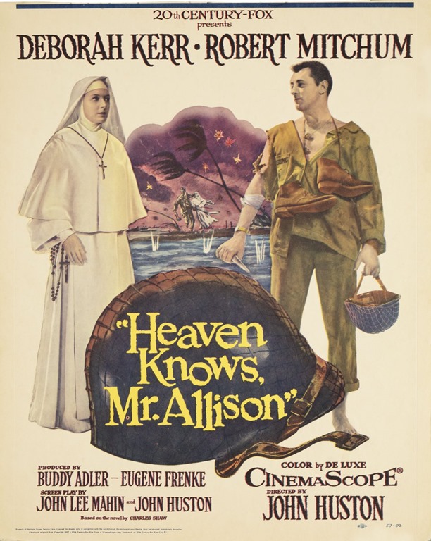 Poster original de Solo Dios lo sabeConcluido su contrato con la RKO, en esos años cincuenta en que el cambio inminente podía intuirse en Hollywood y las estrellas del cine descubrían que les era más rentable la independencia, Mitchum se paseó por distintos estudios, componiendo toda una serie de magníficos personajes. En algunas películas destacó como emblema de la nobleza: es el caso de Río sin retorno (1954), un film que no será excepcional pero que a mí siempre me despierta un cariño muy especial, aun cuando sea porque contiene mi papel favorito de Marilyn Monroe, o de Solo Dios lo sabe (1957), un film muy por debajo de lo que prometía, seguramente porque a su director, John Huston, le falta la cualidad necesaria para convertir su espléndido planteamiento (la convivencia forzada, en una pequeña isla en medio del Pacífico, hostigada por los japoneses en plena guerra mundial, entre una monja —Deborah Kerr, espléndida como casi siempre— y un rudo soldado) en la espléndida historia de amor soterrada que, pese a todo, aun se vislumbra en sus imágenes. Esa cualidad es, precisamente, la que tenían en grado sumo los mencionados Walsh, Ford o Tourneur: el romanticismo.