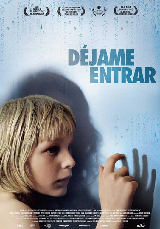Nada sabremos de Eli, salvo que tiene doce años «desde hace mucho tiempo» (hay un fugaz plano en que Oskar la espía mientras se cambia y vemos un borrón oscuro indeterminado en el lugar donde debería estar el sexo de la niña). La acompaña un hombre mayor, humano, que en principio es quien tiene que proporcionarle la sangre que necesita, mediante crímenes atroces, pero que acaba siendo descubierto y perece, lo cual la obliga a ella a arriesgarse personalmente en sus salidas. El título de la historia, como puede adivinar cualquier aficionado, tiene que ver con esa obligación de que el vampiro haya de ser invitado antes de cruzar cualquier entrada y da pie a una escena impresionante: el niño Oskar no la cree y la dolida Eli entra en su casa sin su autorización verbal, comenzando enseguida a manar sangre de todos los orificios de su cuerpecillo. Y si en la novela de Stoker (recogido puntualmente por el film de Coppola), el vampiro rejuvenece cuando se alimenta, aquí es al revés, al menos fugazmente, delatando su edad real: así, cuando bebe con avidez las gotas de sangre del propio Oskar que han caído al suelo, el contraplano, desde el punto de vista del niño, la muestra de pronto envejecida (por supuesto, es otra actriz). Debe destacarse un plano inolvidable, inmejorable expresión de ese uso de lo «normal» en las imágenes: el plano cenital que muestra cómo la niña, por el día, duerme bien protegida de la luz del sol en la bañera, debajo de toallas y telas, en indefensa posición fetal. Lo más discutible de la propuesta es el fácil uso que hace del problema que convierte a Oskar en un marginado, el acoso en el colegio por parte de unos matones, porque además se resuelve de modo muy previsible, con una efectista secuencia de «justicia» por parte de Eli que el film no merecía (aunque la salve, en parte, la realización).