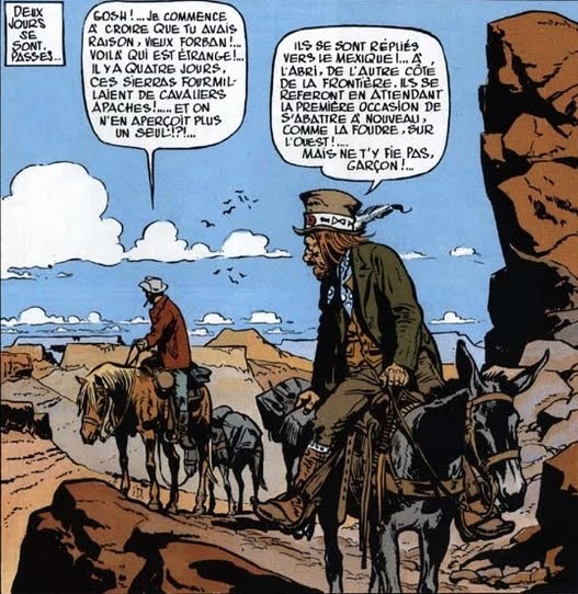 En cuanto a Giraud, es obvio señalar su carácter poliédrico, que lo condujo hasta ese alter ego llamado Moebius, transición que, inevitablemente, también acabó reflejándose en la serie que le dio la fama. Giraud siempre tuvo claro que el Oeste era un espacio visual compartido por todos, lo que obligaba a respetar con realismo sus elementos básicos, y en todo momento se ajustó a esta condición, registrando con enorme veracidad su iconografía básica. Al ser prácticamente su primer trabajo de importancia, su mejora fue haciéndose evidente a medida que avanzaban las aventuras. Las primeras adolecen de una evidente tosquedad, pero a la altura de la quinta, La pista de los navajos, por fin puede señalarse que ha encontrado ese naturalismo sucio que será su seña de identidad y que seguramente encuentre su culminación en la genial entrega duodécima, El fantasma de las balas de oro, en donde la aspereza de los rostros parece otra expresión de la condición mineral del paisaje calcinado por el sol. Este estilo se mantendrá a lo largo de los siguientes, auténtica etapa dorada del género, al menos hasta Angel Face, este último ya paralelo a las primeras andanzas de Moebius en Métal Hurlant. Así, poco a poco el detallismo sucio fue dando paso a una estilizada delicadeza, propia de la depuración que estaba experimentando su dibujo en las historias de ciencia ficción (uso de tramas basadas en puntos y líneas, mayor grado de abstracción…).