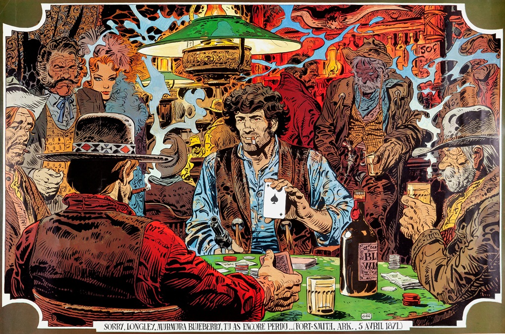No puedo hablar ya apenas de todos estos tebeos: nunca he sido un mitómano que me empeñe en seguir las peripecias de un personaje amado fuera de las manos de sus primeros creadores —por ejemplo, apenas conozco unos pocos Sherlock Holmes que no sean los de Conan Doyle. Pero si sus continuadores han sido consecuentes con el ciclo, imagino que Blueberry habrá seguido siendo el mismo sujeto individualista e indisciplinado, aunque los años tal vez le hayan otorgado algo más de prudencia. Supongo que habrá ganado algo, aunque tampoco conviene que haya sido mucho, en pulcritud pero espero que siga teniendo la misma debilidad por sus dos vicios congénitos: el whisky y el póker. Con un vaso en la mano, seguro de su rapidez para desenfundar el revólver que lleva en el cinto, no me cabe la duda de que Mike S. Blueberry siempre saldrá ganador cuando haya de jugar su última baza.