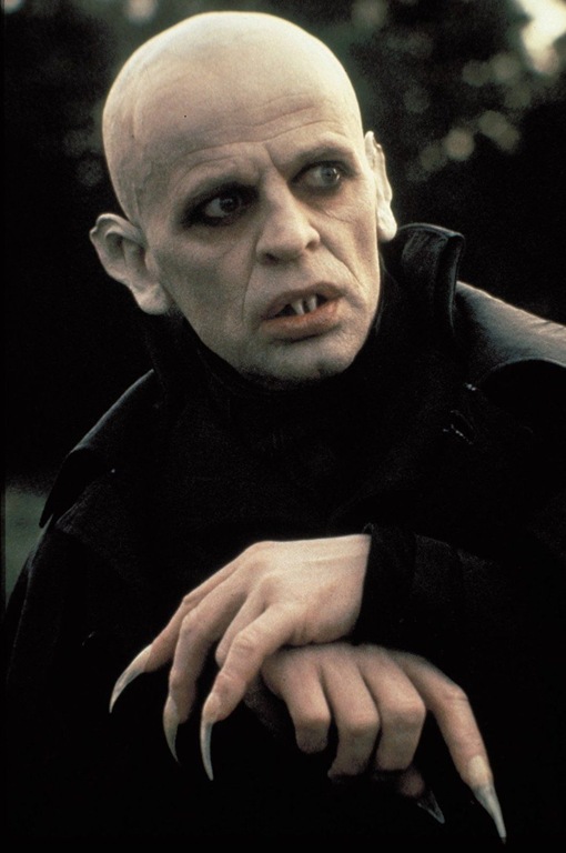 Herzog hizo una importante modificación con respecto al film de Murnau: si el Nosferatu de Schreck es, como ya he dicho, un ser absolutamente ajeno a lo humano, el Nosferatu de Kinski, en cambio, es demasiado humano. Drácula está aquí dominado por un doloroso complejo existencial: la vida inmortal le resulta un infierno del que no puede escapar y ante la amada de Harker, cuya existencia descubre (como en la novela, como en la versión de 1922) por el medallón que este incautamente le muestra, encuentra dentro de sí mismo un inesperado vestigio de esa condición humana que una vez perdió. En una escena inexistente en Murnau —pero que Eggers, significativamente, retoma—, Drácula visita de noche a Lucy Harker y le dice literalmente que «la ausencia de amor es el peor de los dolores» (diálogo que resulta intensamente amargo por la doliente convicción con que Kinski lo formula). De hecho, Nosferatu, vampiro de la noche contiene el plano más patético que se haya visto nunca en una historia de Drácula: aquel en que, recién llegado a la ciudad, este espía desde la ventana la intimidad doméstica de los esposos Harker, todavía con un pudor incontenible, desprendiendo una inesperada nostalgia por una situación que quién sabe si alguna él pudo vivir.