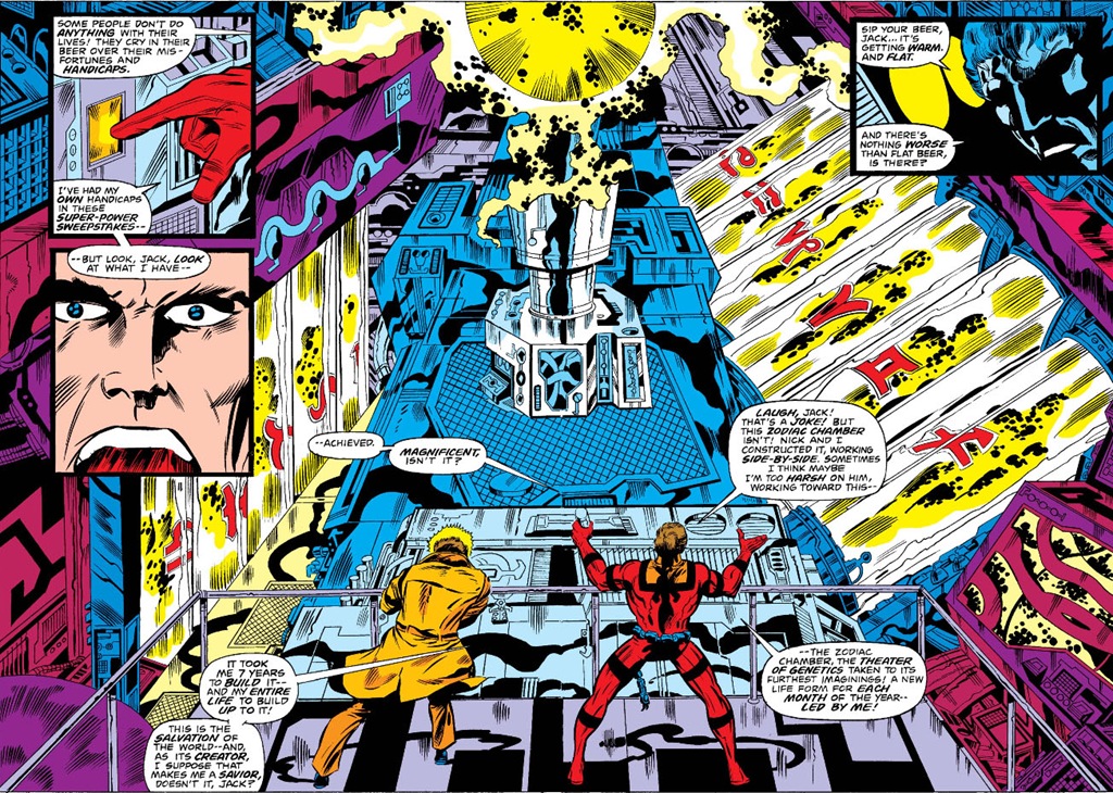 El desconcertante papel de Furia tendrá una explicación tal vez obvia pero muy sugerente. Se trata de uno de los simulacros robóticos del director de SHIELD, una argucia mecánica ideada en las páginas de su serie que a mí siempre me había parecido una tontería efectista pero que aquí resulta inesperadamente sugerente. Que Escorpio asuma las trazas de un personaje shakesperiano compartiendo sus mejores diálogos con un ser artificial y sin voluntad es una inmejorable metáfora: la grandeza trágica de aquel es una grandeza abortada. Y otra feliz idea de Kraft es que ese Zodiaco que Escorpio quiere resucitar sea igualmente un conjunto de seres artificiales, como si ese villano que teme no ser nadie solo pudiera estar en compañía de quienes tienen aún menos sustancia real que él.