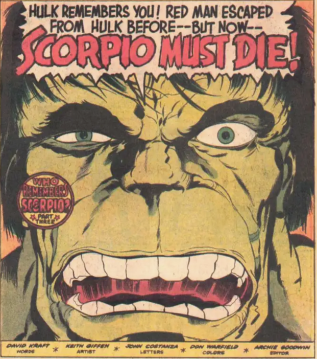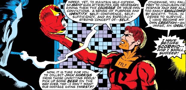 De entre todas las colecciones de grupos de Marvel, Los Defensores nunca fue gran cosa. Sus responsables quisieron personalizarla señalando que los integrantes del equipo en realidad no querían formar ningún equipo: que eran solitarios que solo por azar cruzaban sus caminos y marchaban juntos mientras tenían que detener las aviesas intenciones de algún enemigo. No eran un grupo: eran un no-grupo. Una pequeña falacia que solo hubiera tenido sentido si la colección apenas se hubiera extendido por un puñado de números… pero superó largamente la centena. Aunque por ella pasaron nombres importantes (Steve Gerber, Steve Englehart, Sal Buscema…), en general no hicieron sus mejores trabajos en sus páginas. Y sin embargo, en ellas se encierra uno de los trabajos más admirablemente densos de las dos primeras décadas de la Casa de las Ideas, una pequeña saga que se conoce bajo el título de «¿Quién recuerda a Escorpio?». Una saga que, en principio, no prometía gran cosa tampoco. El guionista que la firmó, David Kraft, no ofreció, en lo que yo sé, nada a la misma altura, de tal modo que también podemos calificarlo como un escritor mediano. El villano que da título a la aventura había aparecido un par de veces en otras series y había sido olvidado: era un villano del montón. Y sin embargo, los inesperados rasgos que singularizan la saga la convierten en una de las historias más memorables de Marvel. Una historia además dotada de una admirable modestia. No hay la menor pretenciosidad en ella y sin embargo, con Escorpio, Marvel propuso un misterioso avatar de nada menos que Hamlet, un villano con problemas de identidad, atormentado por el fracaso al que parece conducirse toda su existencia y porque el tiempo se le echa encima sin que haya tenido ocasión aún de demostrar no ya que es alguien sino que tiene derecho a la plenitud y a la felicidad, una ambición inesperada para lo que a priori suelen perseguir los villanos del género.