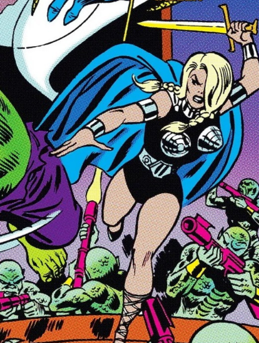 Los otros dos miembros recibieron su carta de naturaleza en la serie. Primero fue la Valquiria, una joven guerrera que había nacido, adulta, en el cuerpo de una muchacha caída en la locura por sus enredos con un culto demoniaco. La Valquiria —de sugestiva caracterización gráfica: una trenza rubia que le tapaba medio rostro, un caballo alado y una espada—, por esa incompletitud de su ser más íntimo, poseía un interés dramático en el que apenas se profundizó, lo cual es otro indicador de la medianía de la serie. El segundo es Halcón Nocturno, un villano de tres al cuarto en sus primeras apariciones (en tebeos como Los Vengadores o Daredevil) que aquí fue pasado a las filas de los buenos. En realidad se trataba de Kyle Richmond, un millonario en busca de emociones fuertes que acababa por encontrar su lugar entre Los Defensores: un héroe que odia la soledad y que quiere encontrar refugio en el gregarismo de sus compañeros. El hombre ideal para ser el pegamento que necesitaban aquellos, si bien el personaje siempre resultó demasiado mediocre, demasiado poco carismático para el propósito. Y sin embargo, irónicamente, tal vez por ello no había otro mejor para semejante y poco lucido papel.