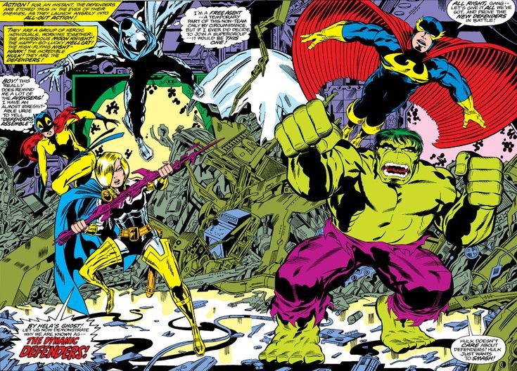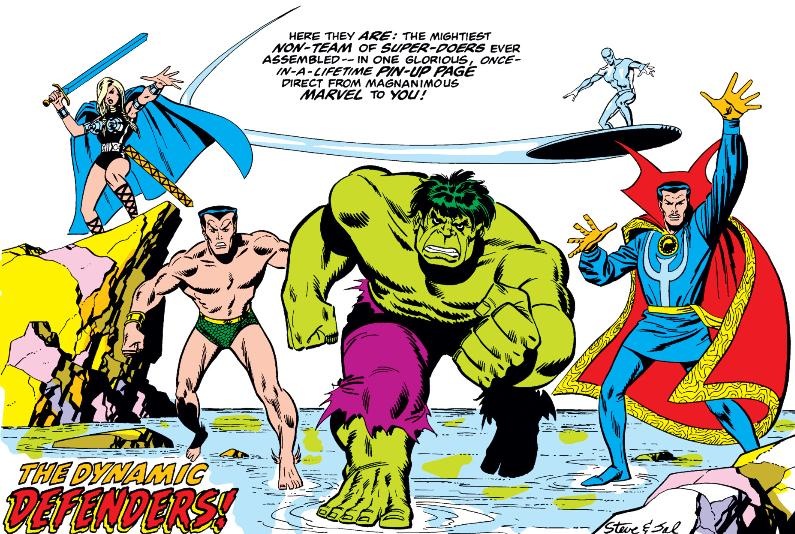 Los Defensores había surgido a principios de los años setenta casi por accidente. Su creador fue Roy Thomas, el hombre al que se suele considerar el delfín de Stan Lee, un joven fan que tuvo la suerte de estar en el momento adecuado, cuando The Man necesitaba a alguien en quien descargar el trabajo que ya se le acumulaba y que fuera lo suficientemente modesto como para seguir sus directrices y remedar fielmente sus fórmulas narrativas. Con objeto de concluir una aventura que había iniciado en una colección que había cerrado inesperadamente (la colección era espléndida, eso sí: Doctor Strange), Thomas la continuó en las páginas de otras dos protagonizadas por grandes solitarios de Marvel como era el mismo Stephen Extraño, el Increíble Hulk y Namor, el Hombre Submarino. Tiempo después, Thomas volvió a unir las trayectorias de estos tres ahora bajo una cabecera titulada The Defenders. Tras un breve tanteo, la colección arrancó en agosto de 1972 y hasta enero de 1989 alcanzaría 139 números más algunos especiales.