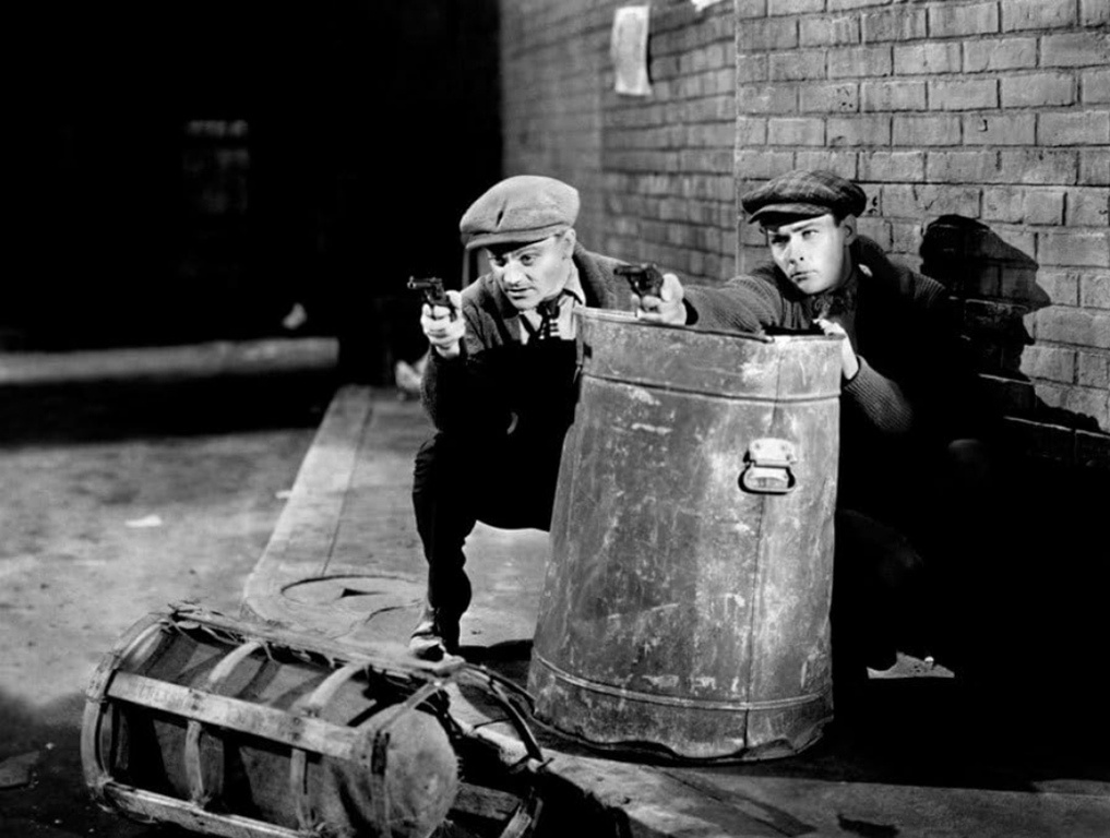 El negocio de esos gangsters urbanos (la crook story se situó ante todo en la gran ciudad) era el ‘racket’, un término más difícil de concretar puesto que en general se refiere al tipo de negocios a que se dedicaban aquellos, centrado en la extorsión (es decir, la imposición de sus productos alcohólicos a los infinitos pequeños negocios que florecieron como hongos, clandestinamente por supuesto, tan pronto se aprobó la Ley Volstead), con su corolario de chantajes, asesinatos, ejecuciones y ajustes de cuentas. En este sentido es emblemática la famosa matanza del día de San Valentín orquestada por Al Capone el 14 de febrero de 1929. En los años sesenta, Roger Corman filmaría una famosa película en torno a este episodio, pero ya había sido llevada al cine, de modo apócrifo, en alguna ocasión, tanto en esos años treinta como en la genial Con faldas y a lo loco (1959), de Billy Wilder, que partía de una parodia cariñosa de la crook story utilizando, no por nada, a uno de sus actores característicos, si bien no de los de mayor peso estelar, el entonces ya veterano George Raft.