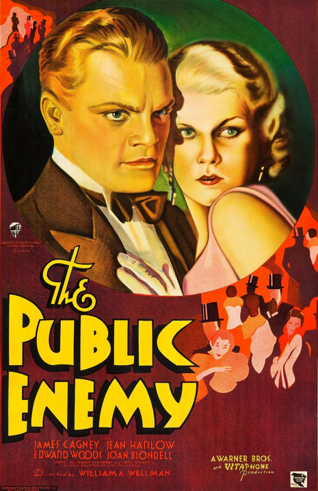 El enemigo publico revelo al gran James CagneyEl pistoletazo oficial de salida del género se sitúa con el estreno cercano, en el escaso periodo de un año y pico, de tres películas míticas: Hampa dorada (Mervyn Le Roy, 1931), El enemigo público (William A. Wellman, 1931) y Scarface, el terror del hampa (Howard Hawks, 1932), esta estrenada con retraso por problemas de la Censura. Cierto es que no partieron de la nada. Por supuesto, y como sucede con el western, esas historias procedían de la literatura: la primera y la tercera, en concreto, de dos novelas de gran éxito de, respectivamente, W. R. Burnett —que en el futuro escribiría otros clásicos literarios también llevados a la gran pantalla como El último refugio y La jungla de asfalto, en la época en que el género había pasado a ser etiquetado como «cine negro»— y Armitage Trail. Es más, en el mismo cine se pueden citar varios precedentes, y además magníficos, de esa mirada centrada en los criminales. La ley del hampa (Josef von Sternberg, 1928), en el final del cine mudo, presenta ya a un gangster exuberante y carismático, pero este manifiesta ciertos rasgos de humanidad que lo redimen en medio de una propuesta virada al melodrama, algo nada extraño en el director. La senda del crimen (Archie Mayo, 1930) nos ofrece a otro del todo amoral, pero insólitamente joven y de aspecto angelical (lo cual, por supuesto, lo hace más peligroso, al encubrir su agraciado aspecto físico la vileza de su carácter). George Bancroft y Lew Ayres (este último recién revelado por su papel de recluta alemán en Sin novedad en el frente), encarnando respectivamente a uno y otro, sin embargo no reincidirían en papeles similares como para rendir a la mitomanía.