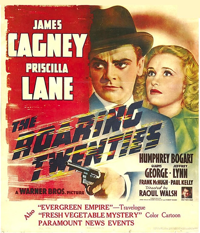 Poster de Los violentos anos veinteJames Cagney despediría la década de los treinta con una gran película que prácticamente supone una paráfrasis del clásico argumento de la crook story que encontraba su canto de cisne con este film (y que por ende iba a morir con él: es su última obra maestra). Se trata de la mencionada Los violentos años veinte, que narra una vez más el ascenso, apogeo y caída final de un delincuente, Eddie Bartlett, que sin corresponder con la figura del gangster brutal vivirá su mismo destino durante los años de la Prohibición. Su director, Raoul Walsh, fue uno de los grandes románticos del cine y esa inflexión matiza lógicamente la mirada que efectúa sobre Eddie, un tipo que ciertamente pierde la batalla al intentar equilibrar el destino violento a que le empujan los condicionamientos sociales —un condicionamiento fatalista pero no burdamente determinista: he ahí el toque romántico del director— y cierta nobleza primordial que, en este caso, le impide descender al estadio de abyección de aquel rol. Aun así, el destino no podrá ser sino la destrucción, primero de su única ilusión verdadera, la sentimental (la chica a la que ama no se enamora de él), y después de su posición en el hampa (acaba arrastrándose, alcoholizado, por las calles de la ciudad que una vez creyó suya) para finalmente encontrar la muerte en un último acto de nobleza (nobleza mediante el uso de la violencia, pues otro modo no puede conocer, matando al hampón que amenazaba a su antigua amada y su esposo). La escena final es otras de las justamente legendarias del género: agonizante, Eddie se arrastra para morir en la escalinata nevada de una iglesia, en los brazos de la única mujer que pudo haberlo hecho feliz pero de quien, fatalmente, nunca se enamoró.