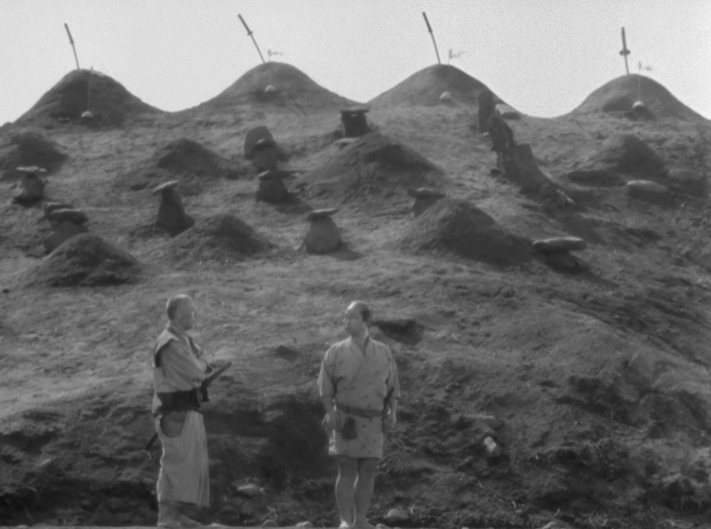 Y aunque sea difícil encontrar un momento o un plano que condense el valor de la película, para mí resulta imposible de olvidar ese cuadro final en que los tres supervivientes contemplan la pequeña elevación donde han enterrado a sus caídos, a los campesinos en primer término y a sus compañeros samuráis en sendos montículos coronados por su katana. Muy cerca, los lugareños ya están empezando a olvidarlos, concentrados en la eterna siembre del arroz, y ellos se miran con el embarazo de lo poco glorioso que ahora parece su hazaña, pero a la vez con la firme convicción de saber que la verdadera nobleza es cumplir lo que nos dicta nuestra conciencia.