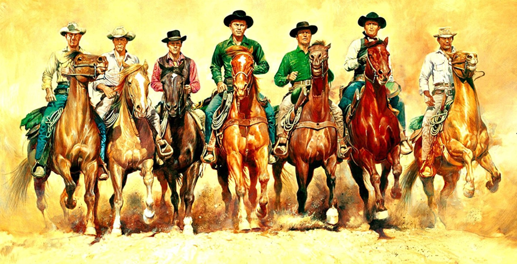 A propósito de esta memorable densidad del film japonés, creo oportuno realizar ahora la comparación con su remake americano, pues uno de los propósitos de este artículo es empujar al descubrimiento del original a quienes no lo crean necesario por conocer la versión occidental. Confieso no haber sentido nunca gran estima por el film de Sturges, aunque lo haya visto más veces que el de Kurosawa. Aquello que es su gran atractivo a la vez es el mayor de sus defectos: el pueril sentido de la mitomanía que revela. Mitomanía no exactamente hacia los actores, sino hacia el dibujo de personajes, en un sentido estelar muy propio de Hollywood. Si digo que no hacia los actores es porque, con la excepción de Yul Brynner, ninguno era muy conocido: como mucho, eran jóvenes prometedores (Steve McQueen, Horst Buchholz, este último una estrella en su Alemania pero no fuera de ella, como señalo en este artículo) o sólidos secundarios, de los cuales al menos tres se convertirían también en importantes estrellas, James Coburn y Charles Bronson en cine y Robert Vaughn en televisión (al más veterano, Brad Dexter, no lo conocía nadie y así siguió, aunque fuera un buen actor).