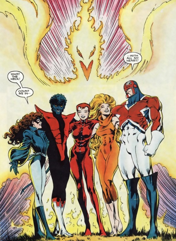 La ya mencionada Masacre Mutante había servido a Chris Claremont para realizar un tajante cambio de alineación en su Patrulla-X: una estrategia de renovación que al guionista inglés, por lo general, siempre le salió bien y que servía para revitalizar la colección en cada momento en que parecía haber cierta acomodación. Para ello, aprovechó que dos de sus miembros emblemáticos, Rondador Nocturno y Gatasombra, habían quedado malheridos en el curso de aquella aventura. Al mismo tiempo retomó al Capitán Britania y a Meggan, libres tras el cierre de la colección que los albergaba. Y como excusa para justificar la creación del nuevo grupo (que, para personalizarlo frente a los ya existentes, tendría su residencia en Gran Bretaña), rescató a otro de sus personajes olvidados, a Rachel Summers, alias Fénix, hija de los emblemáticos Scott Summers/Cíclope y Jean Grey (la Fénix original, muerta en la más genial saga de La Patrulla-X).